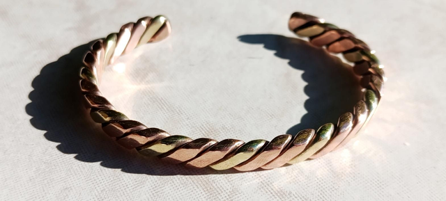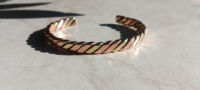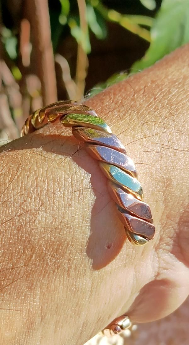 Découvrez ce bracelet artisanal en cuivre pur, sublimé par un fil de laiton doré tressé et martelé à la main pour un rendu unique et lumineux.
