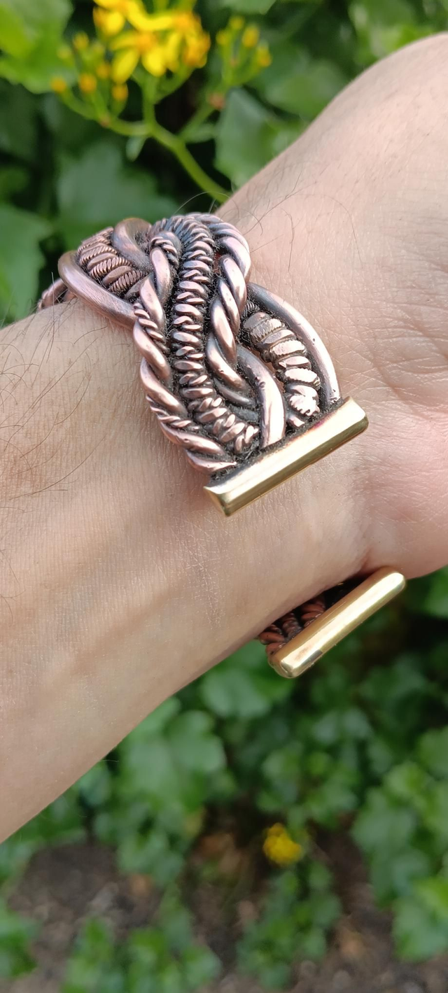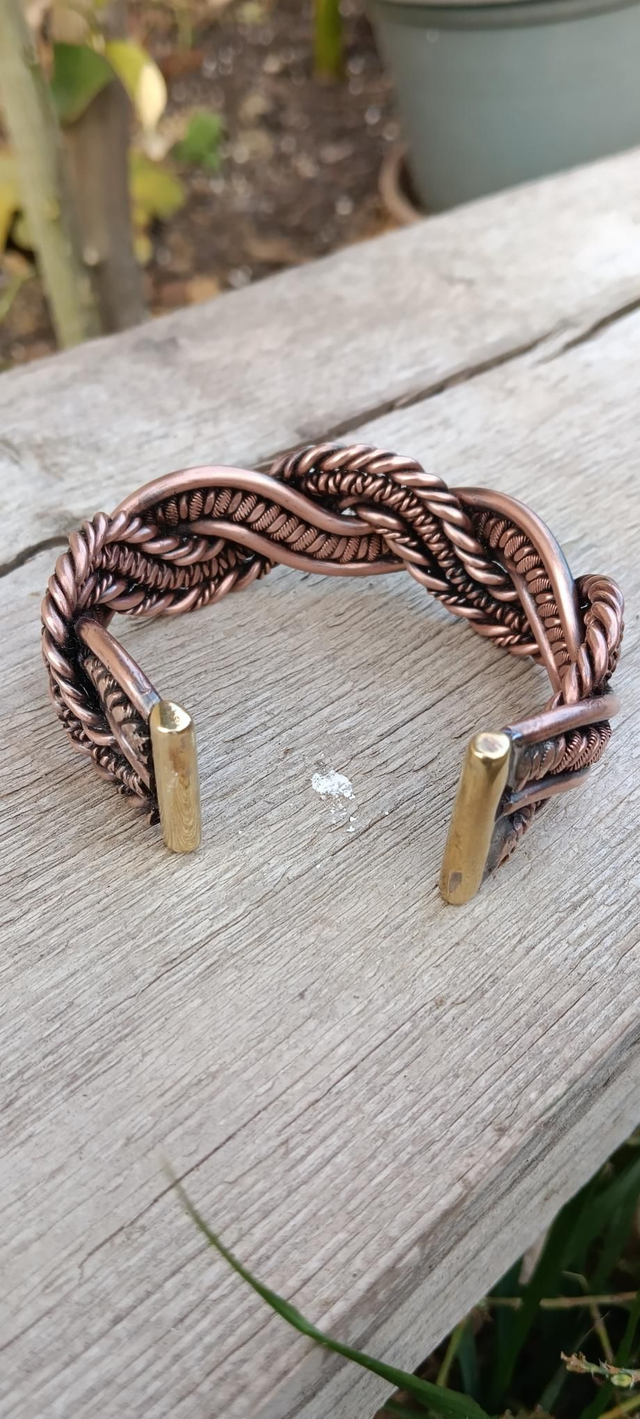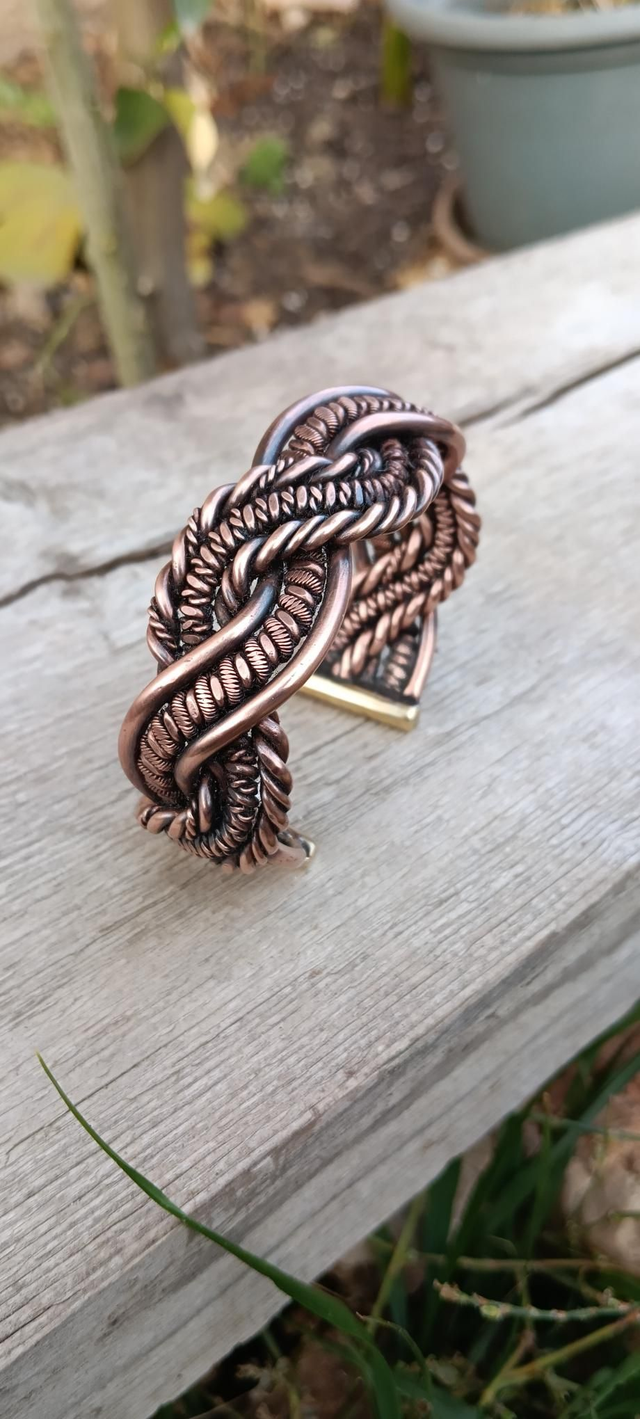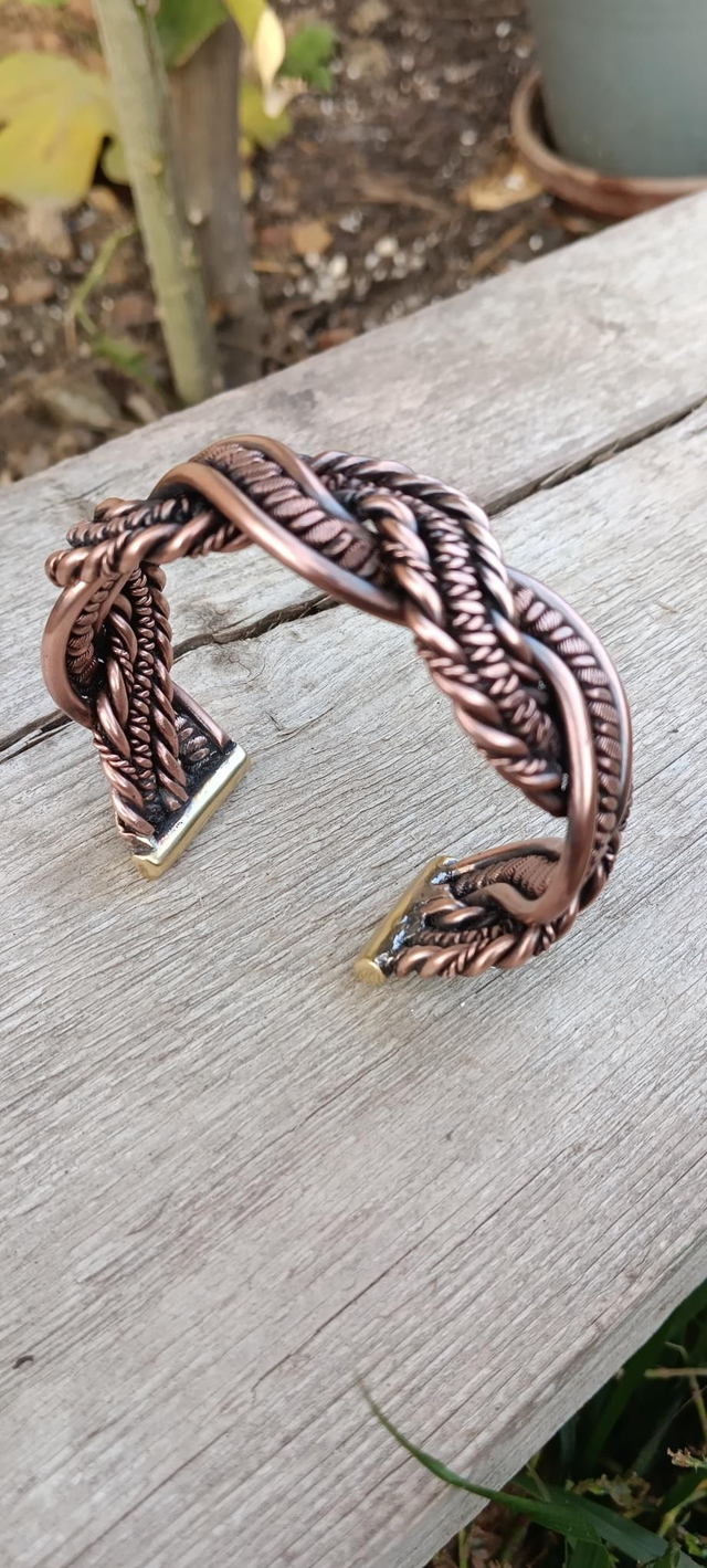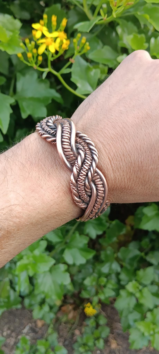 Ce bracelet en cuivre aux multiples tressages est une pièce forte, façonnée entièrement à la main avec soin, patience et minutie. Chaque fil est travaillé et entrelacé un à un, donnant naissance à un bijou riche en détails, à la fois puissant et harmonieux.