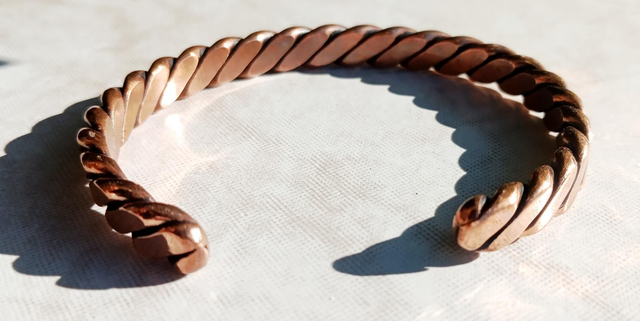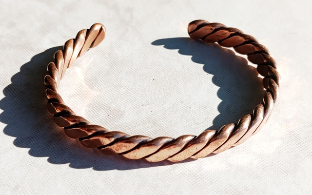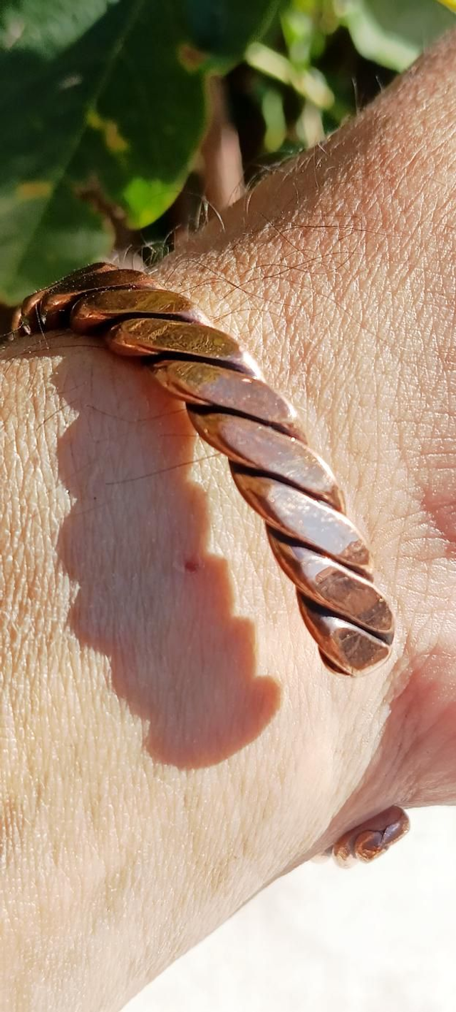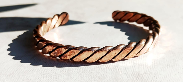 Découvrez ce bracelet artisanal en cuivre pur, composé de 3 fils torsadés et aplatis de 3 mm, offrant un effet visuel unique et élégant.