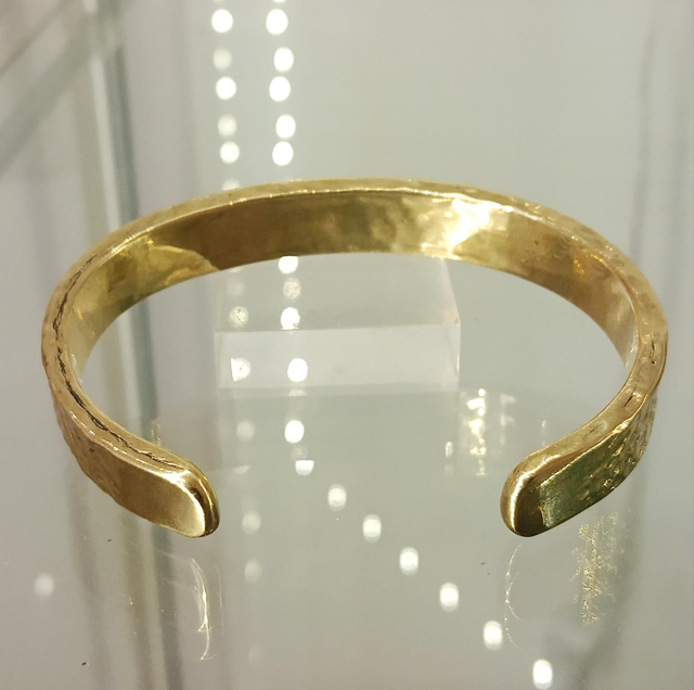 Ce bracelet en laiton est une pièce artisanale, réalisée à partir de métal fondu en lingot puis forgée entièrement à la main selon des techniques traditionnelles. Plus fin et délicat, il présente une largeur de 8 mm et une épaisseur de 2,5 mm, offrant un équilibre parfait entre finesse, solidité et élégance.