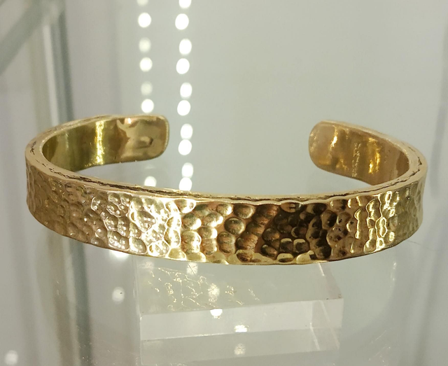 La surface a été martelée minutieusement, créant un relief subtil et durable qui capte la lumière et met en valeur la teinte chaude et naturelle du laiton. Chaque pièce porte ainsi la trace du geste, rendant chaque bracelet unique.