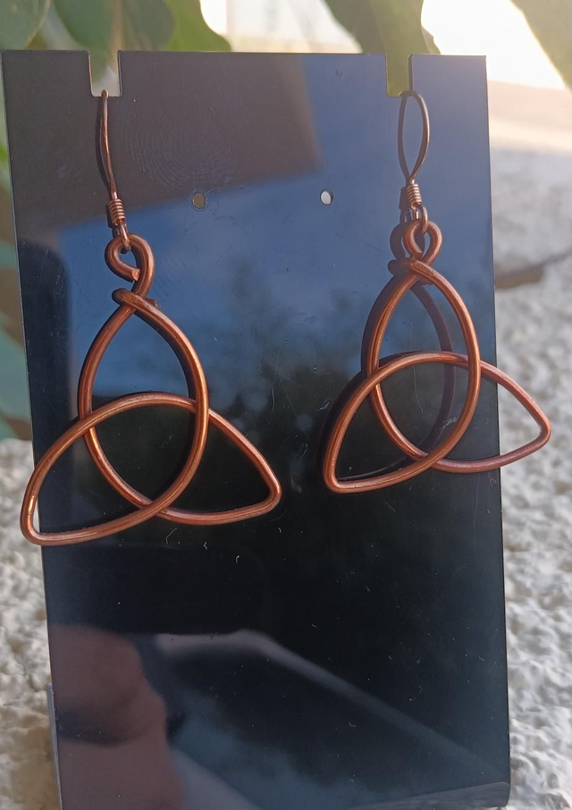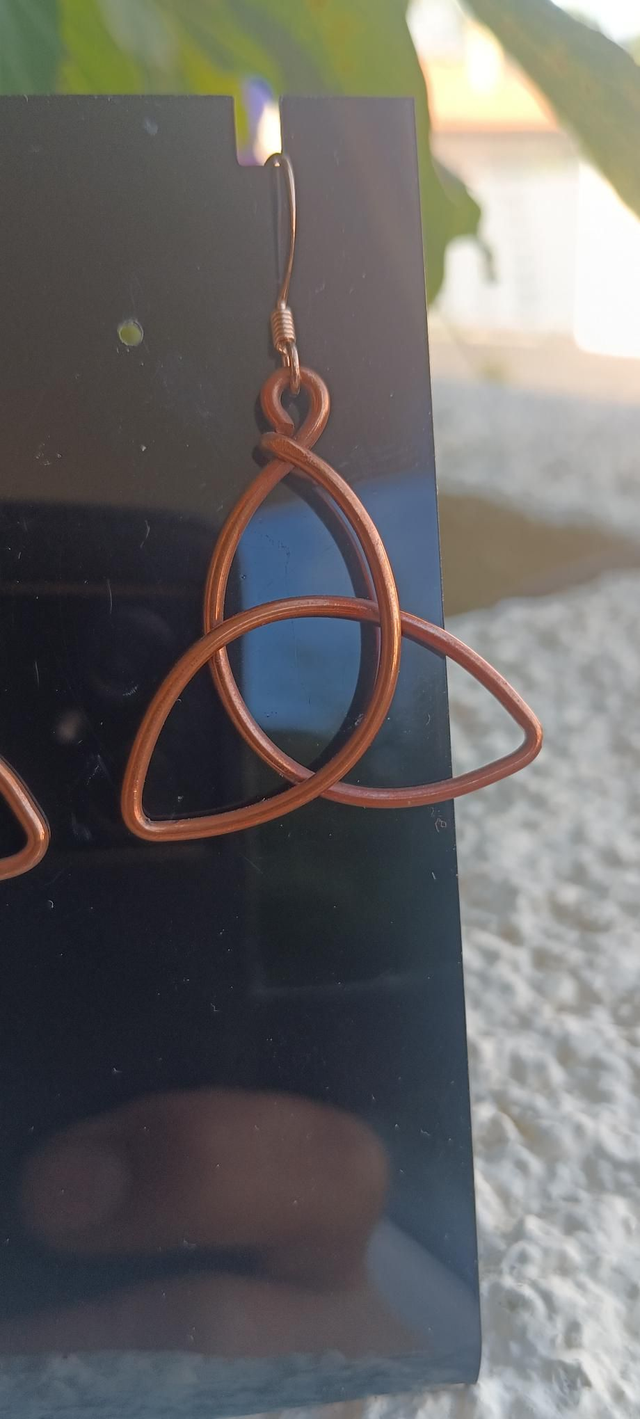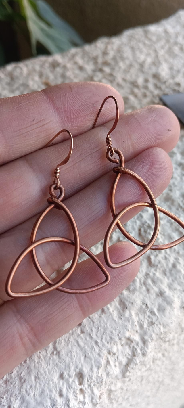 Une jolie paire de boucles d'oreilles en cuivre forme du triquetra symbole qui transcende les frontières culturelles pour incarner l'unité et l'équilibre.