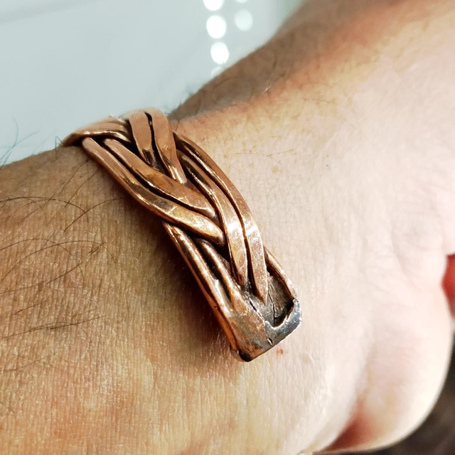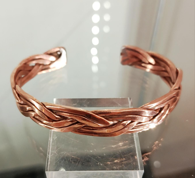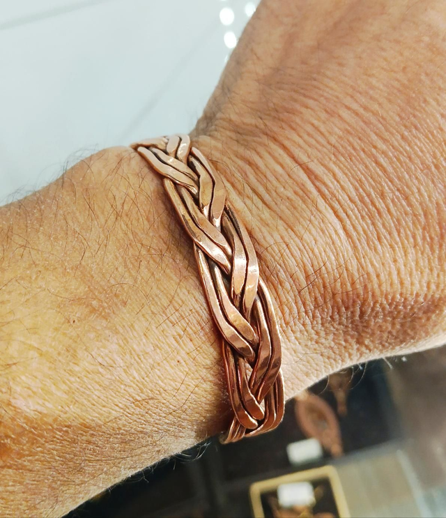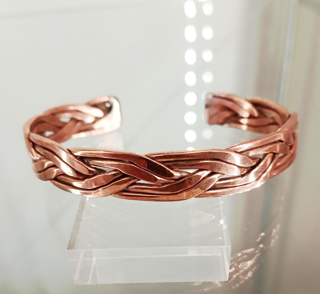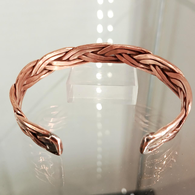 Magnifique bracelet en cuivre réalisé à la main, formé de 6 brins demi-ronds tressés en épi, avec embouts polis et brasés à l’argent pour une touche d’élégance. Ce bijou artisanal conjugue raffinement et bienfaits naturels : le cuivre est réputé pour ses propriétés anti-inflammatoires et son effet apaisant sur les tensions et douleurs articulaires.