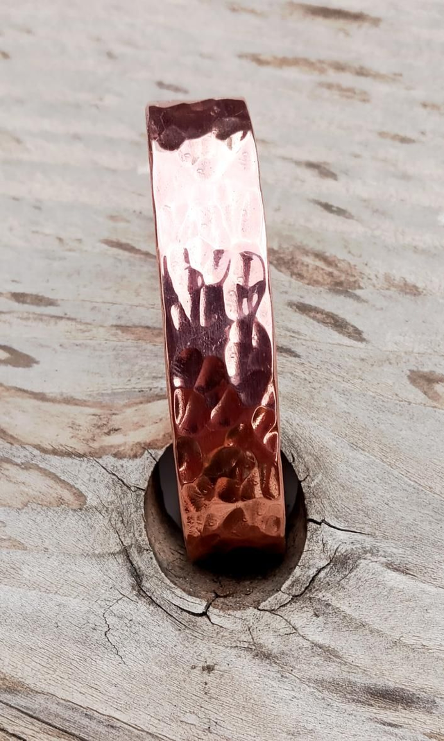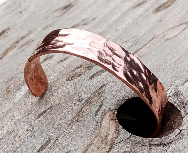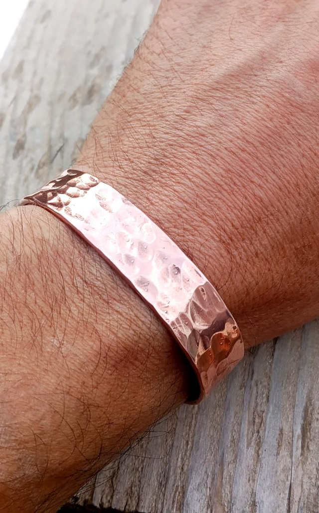 Ce bracelet thérapeutique en cuivre pur à 99,9 % est entièrement façonné à la main artisanalement par mes soins à partir d’une plaque de cuivre pur certifié 2 mm d’épaisseur. Son effet martelé et sa largeur de 1,3 cm en font un bijou à la fois sobre, élégant et efficace.